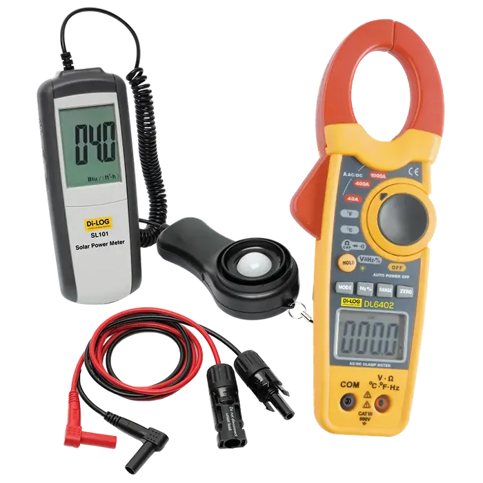 The SL200 is a low cost Solar PV test kit. The kit includes the SL101 – Solar Irradiance Meter and the DL6402 – AC/DC current Clamp meterpackaged in a soft compact carry case.