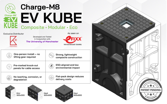The Charge-M8 EV Kube is a UK patent-pending modular EV charger foundation designed for fast, efficient, and scalable installations. Its modular design enables one-person assembly using standard tools, with no need for heavy lifting equipment or concrete, allowing full installation within a single day. Built from a durable, non-conductive composite, EV Kube provides inherent electrical insulation, impact resistance, and a lower carbon footprint compared to traditional concrete bases. Its lightweight, stackable structure reduces transport costs and supports flexible deployment across varied ground conditions. Tested in collaboration with The University of Manchester, EV Kube delivers reliable structural performance while helping installers reduce time, cost, and on-site complexity.